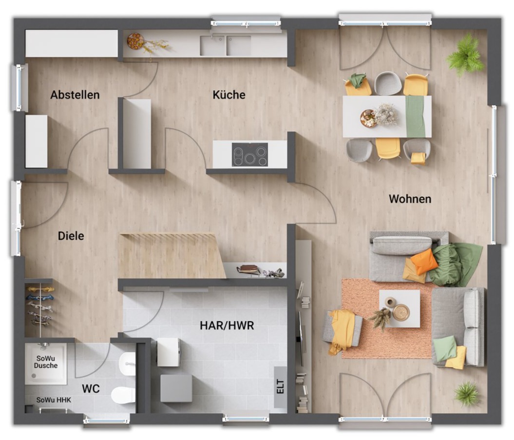 - gerade Treppe (zentral im Erdgeschoss, „teilt“ Koch- und Wohnbereich)