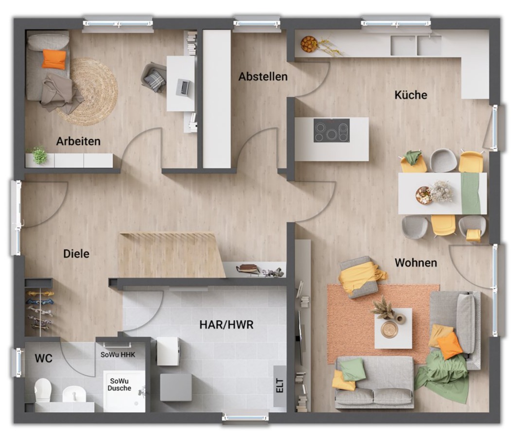 - aufgeräumtes/cleanes Erdgeschoss (Trennung des „technischen“ Bereichs (Hausanschlussraum, WC, Arbeit) vom „gesellschaftlichen“ Bereich (Wohnen, Kochen)