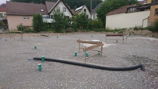 Der Baustart verlief leider überhaupt nicht glatt. Dass man aufgrund des Doppelhauses mit den Nachbarn zeitgleich bauen musste, war am Anfang ein Problem. Der Bau auf dem Nachbargrundstück verzögerte sich, es waren dort zunächst unterschiedliche Baufirmen beschäftigt. So verschob sich auch der Baubeginn von Stefanie und Christian. Der Zeitraum für die Bereitstellungszinsen wurde langsam eng. Der Lizenzpartner von Town & Country Haus hat dann alles darangesetzt, dass mit dem Bau begonnen wurde. „Der Start war schwierig, aber Herr Nickol hat trotzdem alles souverän gemeistert“, fasst Stefanie den verspäteten Baubeginn zusammen. Für die Bauherrin war der ergreifendste Moment der gesamten Bauzeit die fertige Bodenplatte. „Da hast du ganz schön gestrahlt“, erinnert sich Christian lächelnd. Nach dem Anfangsstress signalisierte die fertige Bodenplatte den Startschuss für den Bau.
